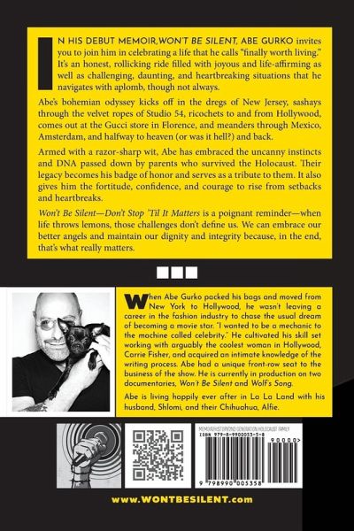 In his debut memoir, Won't Be Silent, Abe Gurko invites you to join him in celebrating a life he calls "finally worth living." It's an honest, rollicking ride filled with joyous, life-affirming as well as challenging, daunting, and heartbreaking situations that he navigates with aplomb, though not always. Abe's bohemian odyssey kicks off in the dregs of New Jersey, sashays through the velvet ropes of Studio 54, ricochets to and from Hollywood, comes out at the Gucci store in Florence, and meanders through Mexico, Amsterdam, and halfway to heaven (or was it hell?) and back. Armed with a razor-sharp wit, Abe has embraced the uncanny instincts and DNA passed down by parents who survived the Holocaust. Their legacy becomes his badge of honor and serves as a tribute to them. It also gives him the fortitude, confidence, and courage to rise from setbacks and heartbreaks. Won't Be Silent-Don't Stop 'til It Matters is a poignant reminder that when life throws lemons, those challenges don't define us. We can embrace our better angels and maintain our dignity and integrity because, in the end, that's what really matters.