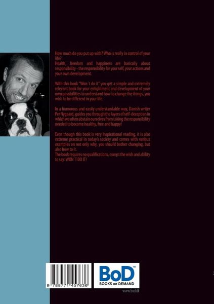 How much do you put up with? Who is really in control of your life?Health, freedom and happiness are basically about responsibility - the responsibility for your self, your actions and your own development. With this book "Won´t do it" you get a simple and extremely relevant book for your enlightment and development of your own possibilities to understand how to change the things, you wish to be different in your life.In a humorous and easily understandable way, Danish writer Per Nygaard, guides you through the layers of self-deception in which we often abstain ourselves from taking the responsibility needed to become healthy, free and happy!Even though this book is very inspirational reading, it is also extreme practical in today's society and comes with various examples on not only why, you should bother changing, but also how to it.The book requires no qualifications, except the wish and ability to say: WON´T DO IT!