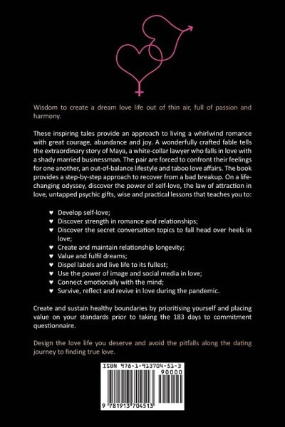 Wisdom to create a dream love life out of thin air, full of passion and harmony. These inspiring tales provide an approach to living a whirlwind romance with great courage, abundance and joy. A wonderfully crafted fable tells the extraordinary story of Maya, a white-collar lawyer who falls in love with a shady married businessman. The pair are forced to confront their feelings for one another, an out-of-balance lifestyle and taboo love affairs. The book provides a step-by-step approach to recover from a bad breakup. On a lifechanging odyssey, discover the power of self-love, the law of attraction in love, untapped psychic gifts, wise and practical lessons that teaches you to: ♥ Develop self-love; ♥ Discover strength in romance and relationships; ♥ Discover the secret conversation topics to fall head over heels in love; ♥ Create and maintain relationship longevity; ♥ Value and fulfil dreams; ♥ Dispel labels and live life to its fullest; ♥ Use the power of image and social media in love; ♥ Connect emotionally with the mind; ♥ Survive, reflect and revive in love during the pandemic. Create and sustain healthy boundaries by prioritising yourself and placing value on your standards prior to taking the 183 days to commitment questionnaire. Design the love life you deserve and avoid the pitfalls along the dating journey to finding true love.