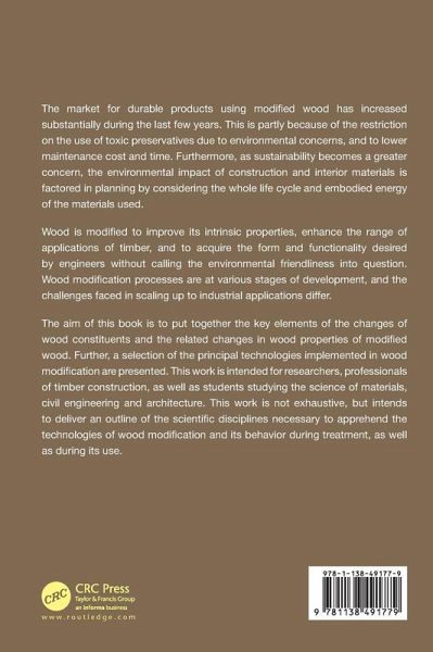 The aim of this book is to put together the key elements of the changes of wood constituents and the related changes in wood properties of modified wood. Further, a selection of the principal technologies implemented in wood modification are presented.