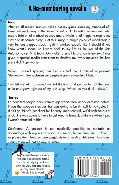 Nico: After an off-season drunken naked hockey game sliced my manhood off, I was whisked away to the secret island of Dr. Horatio Frankenpeen who used a little bit of medical science and a whole lot of magic to restore my crotch to its former glory. Get this: using a magic piece of wood from a famous puppet. Cool, right? It worked exactly like it should if you know what I mean, so I went back to my life as the star of the San Antonio Tower NHL team. Only after a small blip at an interview, I was given a special media consultant to shadow my every move so the bad press didn't get worse. When I started spouting the lies she fed me, I noticed a problem downtown. My replacement eggplant grew every time I lied. That left me with a conundrum: tell the truth and get booted off the team or lie and grow right out of my jock strap. Which do you think I chose? Laurel: I'd coached people back from things worse than angry outbursts before. It was the wooden member that was going to be difficult to navigate. If I didn't get Nico's penchant for honesty under control, we'd both be out of a job. He was going to have to get used to lying. Just like me when I said I wasn't attracted to him. Disclaimer: At present is not medically possible to reattach an appendage with a piece of wood. (Come on, future. Don't let us down!), so please don't hack off any eggplants as a result of this story. And don't worry, there will not be any splinters