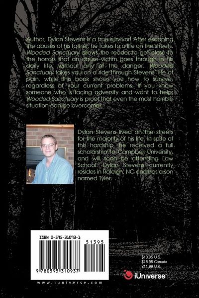 Author, Dylan Stevens is a true survivor! After escaping the abuses of his father, he takes to a life on the streets. Wooded Sanctuary allows the reader to get close to the horrors that an abuse victim goes through in their daily lives, without any of the danger. Wooded Sanctuary takes you on a ride through Stevens life of pain, and at the same time this book shows you how to survive, regardless of your current problems. If you know someone who is facing adversity and you want to help; Wooded Sanctuary is proof that even the most horrible situation can be overcome!