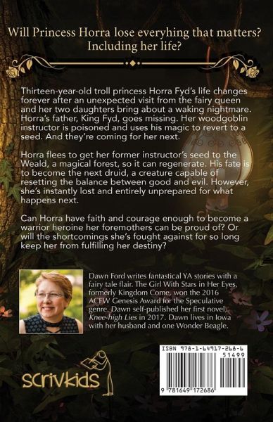 Thirteen-year-old troll princess Horra Fyd's life changes forever after an unexpected visit from the fairy queen and her two daughters. Tales of fairies gave Horra nightmares as a young troll. Before evening falls, however, a real nightmare unfolds. Horra's father, King Fyd, goes missing. Her woodgoblin instructor is poisoned and uses his magic to revert to a seed. And a mysterious, gaunt man wearing a cape and playing a panflute joins the fairies in trying to capture her. Horra flees but is instantly lost in a world she's never had to travel alone. A letter hidden in her knapsack from her late instructor informs her that a power hungry Erlking seeks revenge against her kingdom and their allies for a two-generation old war. She is tasked with getting his seed to the Weald, a magical forest. There it can regenerate into a druid, the only creature with the power to hold the balance between good and evil, and who is able to defeat the Erlking. However, the Erlking is always one step behind her. Horra must fight to protect herself, but she has no magic. She accepts a gift from a dead druid spirit of a charmed woodencloak to disguise her. But magic failed her mother, how can she possibly trust it? Can Horra have faith and courage enough to trust a power she can't see, and become a warrior heroine her foremothers can be proud of? Or will she allow fear to rule over her and lose everything that matters-including her life?