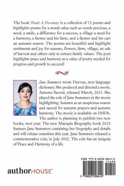 The book Woods A Harmony is a collection of 75 poems and highlights poems for a moral value such as words precious, a need, a smile, a difference for a success, a village a need for a harmony, a farmer and his farm, and a farmer and his cart an autumn season. The poems are beautiful and highlight sentiments and joy for seasons, flowers, farm, village, an ode of harvest and others only to extract family values. The poet highlights peace and harmony as a value of poetry needed for progress and growth to succeed!