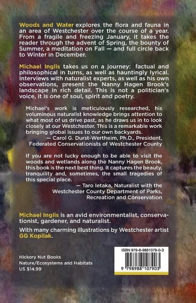 Woods and Water: Walking New York's Nanny Hagen Brook shares the impressions of author, Michael Inglis, as he walks in an area of Westchester's woodlands and wetlands. Over the course of a year he follows life along this little stream, a tributary of the Saw Mill River in the Hudson Valley. In the style of John Muir, Wendell Berry and Rachel Carlson, Michael documents, in lilting language, the intricate natural details he sees along the Nanny Hagen Brook. As an environmentalist, conservationist, gardener, and naturalist, he comments on the beauty and relationships of our entangled species with the natural world. Amongst nature's bounty, he also sees, "an oil can, twelve old tires, some scrap metal have been tossed over the side as if to get rid of them. But they haven't gone away. Still here." He urges us to look deeply, pick up the trash on our walks, and to go out and experience nature. "We have an illusion of separation, but a moment here challenges us to remember all of who we are and how connected life is." This is not a politician's voice - it is one of soul and spirit and poetry. This gem of a book is meticulously researched, with deep naturalist knowledge that brings our attention to what most of us don't notice, drawing us in to look closely at our surroundings. In addition, there are many charming illustrations by Westchester artist GG Kopilak, and an index with information about native plants, birds, and animals. This is a remarkable work bringing global issues to our own backyards.