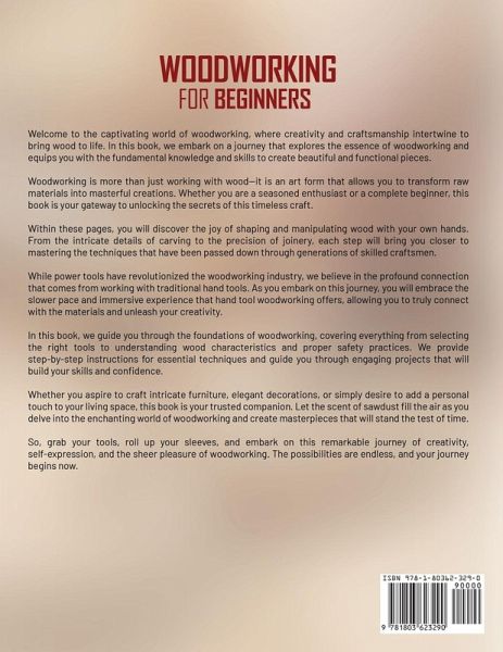 Welcome to the captivating world of woodworking, where creativity and craftsmanship intertwine to bring wood to life. In this book, we embark on a journey that explores the essence of woodworking and equips you with the fundamental knowledge and skills to create beautiful and functional pieces. Woodworking is more than just working with wood-it is an art form that allows you to transform raw materials into masterful creations. Whether you are a seasoned enthusiast or a complete beginner, this book is your gateway to unlocking the secrets of this timeless craft. Within these pages, you will discover the joy of shaping and manipulating wood with your own hands. From the intricate details of carving to the precision of joinery, each step will bring you closer to mastering the techniques that have been passed down through generations of skilled craftsmen. While power tools have revolutionized the woodworking industry, we believe in the profound connection that comes from working with traditional hand tools. As you embark on this journey, you will embrace the slower pace and immersive experience that hand tool woodworking offers, allowing you to truly connect with the materials and unleash your creativity. In this book, we guide you through the foundations of woodworking, covering everything from selecting the right tools to understanding wood characteristics and proper safety practices. We provide step-by-step instructions for essential techniques and guide you through engaging projects that will build your skills and confidence.Whether you aspire to craft intricate furniture, elegant decorations, or simply desire to add a personal touch to your living space, this book is your trusted companion. Let the scent of sawdust fill the air as you delve into the enchanting world of woodworking and create masterpieces that will stand the test of time. So, grab your tools, roll up your sleeves, and embark on this remarkable journey of creativity, self-expression, and the sheer pleasure of woodworking. The possibilities are endless, and your journey begins now.