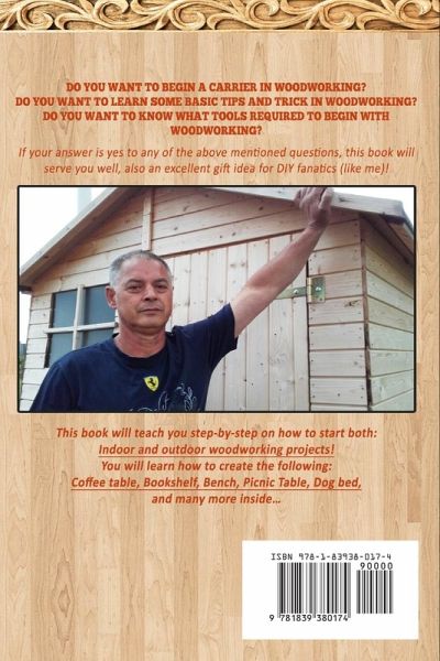 Get ready for several indoor and outdoor furniture woodworking plans to start out on! These plans come to you in simple and easy to understand texts. By making the items in this book, you will start your woodworking venture out right, with solid advice, stable basic skill sets, and techniques that will ensure a success! Don't get sucked into just any plans on the internet, not everyone out there knows the right way to work with wood, and many of them will leave you frustrated, discouraged, and embarrassed. Sure, anyone can screw a few boards together, but is it going to last? With this book, you will get tried and true plans to create simple, reliable, and sensational works of art! You will learn the fundamentals of furniture building by practice and hands-on experience. Many of the plans showcased in this book can be modified to fit your needs as well, meaning you can change the plans of the Queen Bed Frame to fit a Twin, Double/Full, King, and California King sized beds. You can change a few measurements and go from the average eight-foot table length to a ten foot or even sixteen-foot banquet table, you can even go down to a four-foot apartment table! Don't miss out on starting out right with these easy, flexible, and fun plans for furniture both indoors and outdoors! Some of the plans included in this book are: A bookshelf that can be easily adjusted in every direction to fit your needs and your space, or your customer's space! A beautiful dining room table with a matching bench that can easily be adjusted to fit the allotted space! A bunk bed that will save precious bedroom space for either a single sleeper with storage or workspace below, or turn it into a double sleeper to get optimal space in the room! A rustic coffee table that will compliment any interior decor theme! A simple and easy picnic table that can be used for mass production and mass profits! With a little practice, you can easily make ten of these beauties at a time! An essential workbench for any trade. It's customizable to fit the needs of the user and the space available! Add storage boxes, drawers, bins on caster wheels, hooks to hang hand tools, and other customizable features! An outdoor, box jointed bench for any space. It is as decorative as it is simple! This plan is also highly customizable, you can add your own creative touches to spice up this lovely bench! A simple and rustic dog bed that your pooch will love! Add some decorative hardware and a water-resistant pillow, and it's a throne fit for the furry member of the family! And much, Much more!! You will get easy, simple, and adjustable plans to start your new hobby out right!