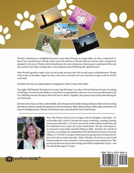 Woody's Adventures is a delightful interactive series about Woody, an orange tabby cat with a crooked tail. In Book One, Good Fortune, Woody is four years old and lives at Wood's Humane Society while waiting to be adopted. In this story, Woody and his friends learn the value of patience, listening and a joyful spirit.They also play and have fun while creating what a wise shepherd named Old Dog calls, "good fortune". Meet Woody's guardian angel. A tiny cat with wings and and a halo. She is small, smart, and bothersome. Woody refers to her as Guardian Angel Cat. Sam, a flea, lives in Woody's fur coat. Sam likes to dig in with his all-flea rock band. Christine and Anna are college students managing the critters living at the shelter. One night, Old Dog tells Woody how he creates "good fortune" every day at Wood's Humane Society. According to Old Dog, everyone has the ability to create their own good fortune. However, not everyone understands what it is. Old Dog promises Woody to show him how he does it. Together, they plan to meet on the patio during the next full moon. Join them all at a fancy cat show, in the bathtub, and on the patio at the shelter during a full moon. Share in their exciting adventures and then consider the questions in the Something to Think About sections. Both reader and listener will enjoy the thought process. Sit back, kick off your shoes and enjoy Book One, Good Fortune.