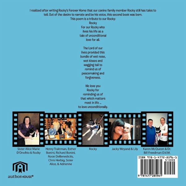 I realized after writing Rocky's Forever Home that our canine family member Rocky still has tales to tell. Out of the desire to narrate and be his voice, this second book was born. This poem is a tribute to our Rocky: Rocky For our Rocky who lives his life as a tale of unconditional love for all. The Lord of our lives provided this bundle of wet nose, wet kisses and wagging tail to remind us of peacemaking and forgiveness. We love you Rocky for reminding us of that which matters most in life ... to love unconditionally.