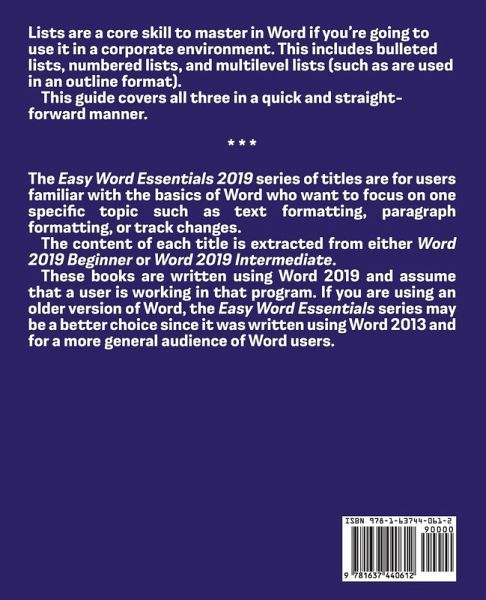 Lists are a core skill to master in Word if you're going to use it in a corporate environment. This includes bulleted lists, numbered lists, and multilevel lists (such as are used in an outline format). This guide covers all three in a quick and straight-forward manner. * * * The Easy Word Essentials 2019 series of titles are for users familiar with the basics of Word who want to focus on one specific topic such as text formatting, paragraph formatting, or track changes. The content of each title is extracted from either Word 2019 Beginner or Word 2019 Intermediate. These books are written using Word 2019 and assume that a user is working in that program. If you are using an older version of Word, the Easy Word Essentials series may be a better choice since it was written using Word 2013 and for a more general audience of Word users.
