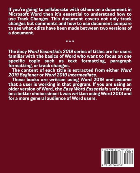 If you're going to collaborate with others on a document in Microsoft Word then it's essential to understand how to use Track Changes. This document covers not only track changes but comments and how to use document compare to see what edits have been made between two versions of a document. * * * The Easy Word Essentials 2019 series of titles are for users familiar with the basics of Word who want to focus on one specific topic such as text formatting, paragraph formatting, or track changes. The content of each title is extracted from either Word 2019 Beginner or Word 2019 Intermediate. These books are written using Word 2019 and assume that a user is working in that program. If you are using an older version of Word, the Easy Word Essentials series may be a better choice since it was written using Word 2013 and for a more general audience of Word users.