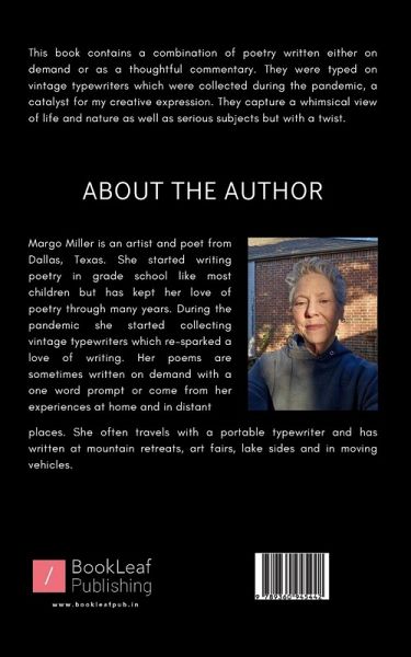 This book contains a combination of poetry written either on demand or as a thoughtful commentary. They were typed on vintage typewriters which were collected during the pandemic, a catalyst for my creative expression. They capture a whimsical view of life and nature as well as serious subjects but with a twist.