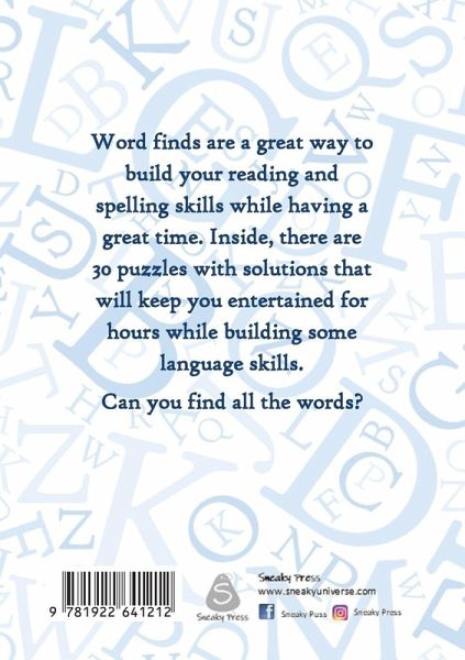 Not only are word finds fun but they are great for building literacy skills. They can help develop word recognition, pattern recognition skills, improve spelling, expand and revise vocabulary Word Finds Volume 1 contains 30 themed word find puzzles suitable for children and adults of all ages.