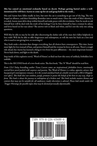 Mia has caused an emotional avalanche based on deceit. Perhaps getting buried under a well-intentioned lie will force Aaron to come up for air and grasp hold to the truth... Mia and Aaron have fallen madly in love, but now the cat is scratching to get out of the bag. The two forged an alliance, and their friendship flourishes into so much more. Once the truth of Mia's identity is revealed, Aaron must delve deep within himself and make peace with this revelation. Now he needs to ask himself how will he deal with the truth of his feelings? Can he force himself to hate a woman he adores and loves based on her race alone? The answer isn't so black and white, and he's not the only one asking questions. Will Mia be able to stay by his side after discovering the darker side of the man she's fallen helplessly in love with? Will she be able to offer forgiveness and redemption, or will she turn her back on a lost soul who is used to not giving love, or receiving it? They both make a decision that changes everything, but all choices have consequences. This time Aaron must fight for love instead of hate, and protect himself and the woman he loves at all costs. There's a rough ride ahead, but Aaron has learned a thing or two from his past affiliations - the most important lessons? Never back down, and fight to the death. Step inside of this explosive novel, 'Word of Honor', to find out how this story of unlikely, forbidden love unfolds. This is the SECOND book of a two-book series. The first book, "The 'N' Word" should be read first. From USA Today bestselling author Tiana Laveen comes an inspirational, forbidden lovers, emotionally scarred hero novel packed with suspense and passion. The Word of Honor is a taboo, opposites attract, bad boy/good girl contemporary romance. It is the second and final book of a double novel with a HEA (Happily-ever-after). This book does not condone, justify, promote or praise the beliefs of the hero in any way, shape or form. This book is about the journey to redemption of a broken soul. This book includes mature themes and content that may not be suitable for all audiences; reader discretion is advised. Please look inside under the 'Trigger Warnings' for possible topics that may be deemed personally objectionable.