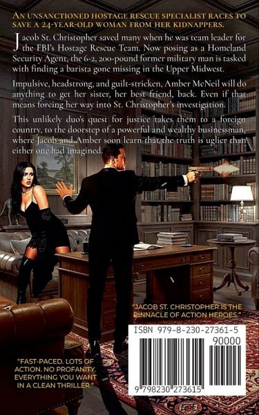 Perfect for those who love thrillers with a good and decent main character - noble friends - action - clean language - no graphic sex - a little romance - and an undertone of faith from a Christian worldview. An unsanctioned hostage rescue specialist races to save a 24-year-old woman from her kidnappers. Jacob St. Christopher saved many when he was team leader for the FBI's Hostage Rescue Team. Now posing as a Homeland Security Agent, the 6-2, 200-pound former military man is tasked with finding a barista gone missing in the Upper Midwest. Impulsive, headstrong, and guilt-stricken, Amber McNeil will do anything to get her sister, her best friend, back. Even if that means forcing her way into St. Christopher's investigation. This unlikely duo's quest for justice takes them to a foreign country, to the doorstep of a powerful and wealthy businessman, where Jacob and Amber soon learn that the truth is uglier than either one had imagined. Action-packed, clean-language hostage rescue thriller where evil people prey upon the weak, and where one ex-military man, once again called to serve, stands ready to step into the breach to save those in need. - Book #2 in the Jacob St. Christopher series of Action Thrillers -