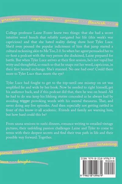 College professor Laine Foster knows two things: her secret intuitive word hunch reliably navigates her life (this week's was capricious) and that she hates reality dating show host Tyler Luce. She's even penned the popular indictment of him that jump started a cultural reckoning akin to Me Too, 2.0. So when her agent persuaded her to co-host a podcast with the very person she disdains, Laine prepares for battle. But when Tyler Luce arrives at their first session, he's not vapid but witty and thoughtful, so much so that he snaps out her word, capricious, in their first heated exchange. She's stunned. No one had ever! Could there more to Tyler Luce than meets the eye? Tyler Luce had fought to get to the top until one misstep on set was amplified far and wide--by that woman's book. Now he needs to right himself, get his audience back, and if this podcast did that, then he's on board. All he had to do was keep his lifelong stutter concealed as he always had by avoiding trigger words with his mental thesaurus. That, and never doing any live episodes. And then especially not getting rattled in front of this know-it-all academic. Friends and family are warning him, but how hard could this be? From sauna sessions to sushi dinners, romance writing to coffee errands, their unfolding passion challenges Laine and Tyler to come to terms with their deepest secrets and find their true path in life and their possible way forward. Together.