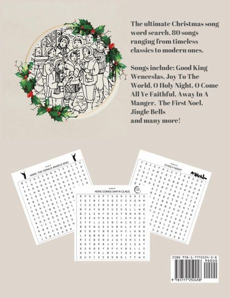 Christmas song word search puzzle book which can be enjoyed by all ages If you love word search puzzles and Christmas, you will love this book! The book contains 80 word search puzzles based on popular modern Christmas songs, classical carols and traditional hymns. For ease of use, each puzzle is listed on its own page. Large print lettering has been used throughout the book. As a result, this puzzle book can also be enjoyed by seniors or people with eyesight issues. Makes a wonderful gift for Christmas lovers of any age from children, teens, parents to grandparents. Features:80 word search puzzles of popular Christmas songs, classical carols and traditional hymns Songs such as: Good King Wenceslas, Joy To The World, O Holy Night, O Come All Ye Faithful, Away In A Manger, The First Noel, Jingle Bells and many, many more! Soft, matte cover Paperback Spacious 8.5" x 11" size One puzzle per page Large font/large print Solutions provided at the end