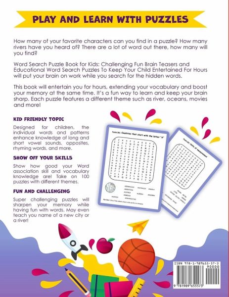 Play and Learn with Puzzles! How many of your favorite characters can you find in a puzzle? How many rivers have you heard of? There are a lot of word out there, how many will you find? Word Search Puzzle Book for Kids: Challenging Fun Brain Teasers and Educational Word Search Puzzles to Keep Your Child Entertained for Hours will put your kid's brain on work while they search for the hidden words. Designed for children, the individual words and patterns enhance knowledge of long and short vowel sounds, opposites, rhyming words, and more. This book will entertain your children for hours, extending their vocabulary and boost their memory at the same time. It's a fun way to learn and keep your brain sharp. Each puzzle features a different theme such as river, oceans, movies and more! Inside this book you will find: 100 original word search puzzles with kid-friendly themes (e.g. World wonders, Buildings & places, etc.) Fun Facts of each theme Puzzles that range from easy to challenging, but all age appropriate. Words and themes that Enhances multiple skills like vocabulary, spelling, and word association. They'll look up, down, and diagonally too, to uncover a buried treasure of hidden words. Young puzzle lovers can show what sharp eyes they have with this huge collection of word searches. There are 100 puzzles with different themes to take on. Super challenging puzzles will sharpen their memory while having fun with words. May even teach them name of a new city or a river! Click the "Buy Now Button" and help your child find fun in words and build a foundation for lifetime learning.