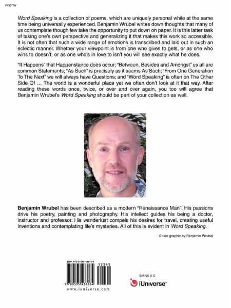 Word Speaking is a collection of poems, which are uniquely personal while at the same time being universally experienced. Benjamin Wrubel writes down thoughts that many of us contemplate though few take the opportunity to put down on paper. It is this latter task of taking one's own perspective and generalizing it that makes this work so accessible. It is not often that such a wide range of emotions is transcribed and laid out in such an eclectic manner. Whether your viewpoint is from one who gives to gets, or as one who wins to doesn't, or as one who's in love to isn't you will see exactly what he does. "It Happens" that Happenstance does occur; "Between, Besides and Amongst" us all are common Statements; "As Such" is precisely as it seems As Such; "From One Generation To The Next" we will always have Questions; and "Word Speaking" is often on The Other Side Of . The world is a wonderful place yet we often don't look at it that way. After reading these words once, twice, or over and over again, you too will agree that Benjamin Wrubel's Word Speaking should be part of your collection as well.