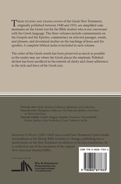 These studies and translations of the Greek New Testament are simplified commentaries on the Greek text for the Bible student who is not conversant with the Greek language. The four-volume set includes commentaries on the Gospels and Epistles; graphic elucidations of selected passages, words, and phrases; and devotional studies on the teachings of Jesus and the apostles. A complete biblical index is included in each volume.