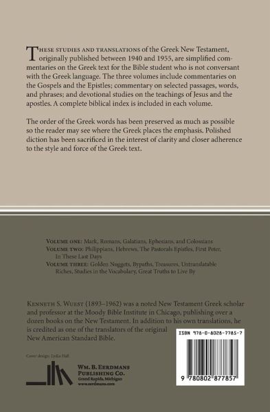 These studies and translations of the Greek New Testament are simplified commentaries on the Greek text for the Bible student who is not conversant with the Greek language. The four-volume set includes commentaries on the Gospels and Epistles; graphic elucidations of selected passages, words, and phrases; and devotional studies on the teachings of Jesus and the apostles. A complete biblical index is included in each volume.