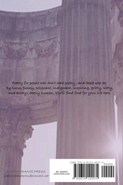 Poetry for people who don't read poetry and those who do. Poetry that's "gettable," by turns funny, poignant, indignant, inspiring, gritty, witty, contemplative...and deeply human. Poems about dancing Miss Daisy, the last time, humble pie, God's eyes, a Heads-of-State grudge match, sex after 60 (yes, there is!), a regrettable middle-of-the-night e-mail, the 5-minute kiss...and more. These poems remind us to mine life for treasure--in dark times and bright, in the ordinary and the extraordinary.