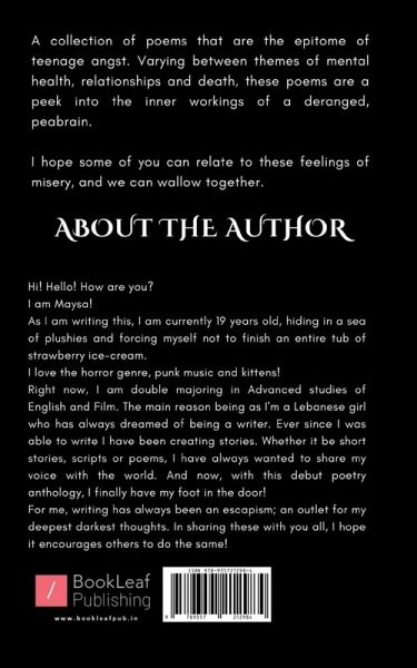 ""A collection of poems that are the epitome of teenage angst. Varying between themes of mental health, relationships and death, these poems are a peek into the inner workings of a deranged, peabrain. I hope some of you can relate to these feelings of misery, and we can wallow together.""