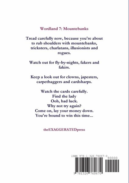 Tread carefully now, because you're about to rub shoulders with mountebanks, tricksters, charlatans, illusionists and rogues. Watch out for fly-by-nights, fakers and fakirs. Keep a look out for clowns, japesters, carpetbaggers and cardsharps. Watch the cards carefully. Find the lady. Ooh, bad luck. Why not try again? Come on, lay your money down. you're bound to win this time...Wordland 7; edited by Allen Ashley and packed full of fiction and poetry from, Lynn Hoffman, Joan McNerney, James G. Piatt, Liz Gwinnell, Gary Budgen, Rhys Hughes, Larry Leftkowitz, David Turnbull, Parker Weston, Paul Hostovsky, Nigel Wilson, Lana Bella, Ken Poyner, Stephen Oram, J,J, Steinfeld, Len Kuntz, A. J. Kirby, Ruth Sabath Rosenthal, Toti O'Brien and Sarah Doyle. Cover art by Faye Reynolds.