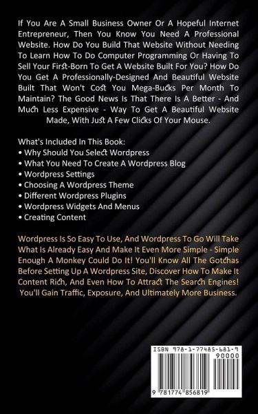 If You Are A Small Business Owner Or A Hopeful Internet Entrepreneur, Then You Know You Need A Professional Website. How Do You Build That Website Without Needing To Learn How To Do Computer Programming Or Having To Sell Your First-Born To Get A Website Built For You? How Do You Get A Professionally-Designed And Beautiful Website Built That Won't Cost You Mega-Bucks Per Month To Maintain? The Good News Is That There Is A Better - And Much Less Expensive - Way To Get A Beautiful Website Made, With Just A Few Clicks Of Your Mouse. What's Included In This Book:Why Should You Select Wordpress What You Need To Create A Wordpress Blog Wordpress Settings Choosing A Wordpress Theme Different Wordpress Plugins Wordpress Widgets And Menus Creating Content Wordpress Is So Easy To Use, And Wordpress To Go Will Take What Is Already Easy And Make It Even More Simple - Simple Enough A Monkey Could Do It! You'll Know All The Gotchas Before Setting Up A Wordpress Site, Discover How To Make It Content Rich, And Even How To Attract The Search Engines! You'll Gain Traffic, Exposure, And Ultimately More Business.