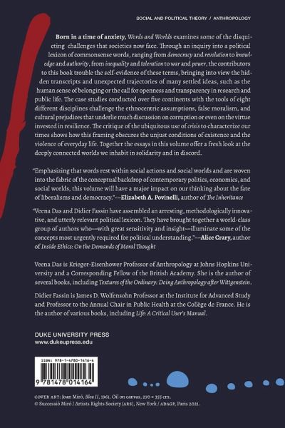 Born in a time of anxiety, Words and Worlds examines some of the disquieting challenges that societies now face. Through an inquiry into a political lexicon of commonsense words, ranging from democracy and revolution to knowledge and authority, from inequality and toleration to war and power, the contributors to this book trouble the self-evidence of these terms, bringing into view the hidden transcripts and unexpected trajectories of many settled ideas, such as the human sense of belonging or the call for openness and transparency in research and public life. The case studies conducted over five continents with the tools of eight different disciplines challenge the ethnocentric assumptions, false moralism, and cultural prejudices that underlie much discussion on corruption or even the virtue invested in resilience. The critique of the ubiquitous use of crisis to characterize our times shows how this framing obscures the unjust conditions of existence and the violence of everyday life. Together the essays in this volume offer a fresh look at the deeply connected worlds we inhabit in solidarity and in discord. Contributors. Banu Bargu, Veena Das, Alex de Waal, Didier Fassin, Peter Geschiere, Behrooz Ghamari-Tabrizi, Caroline Humphrey, Ravi Kanbur, Julieta Lemaitre, Uday S. Mehta, Jan-Werner Müller, Jonathan Pugh, Elizabeth F. Sanders, Todd Sanders