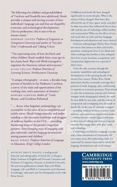Childhood and family life have changed significantly in recent decades. What is the nature of these changes? How have they affected the use of time, space, work and play? In what ways have they influenced face-to-face talk and the uses of technology within families and communities? Eminent anthropologist Shirley Brice Heath sets out to find answers to these and similar questions, tracking the lives of 300 black and white working-class families as they reshaped their lives in new locations, occupations and interpersonal alignments over a period of thirty years. From the 1981 recession through the economic instabilities and technological developments of the opening decade of the twenty-first century, Shirley Brice Heath shows how families constantly rearrange their patterns of work, language, play and learning in response to economic pressures. This outstanding study is a must-read for anyone interested in family life, language development and social change.