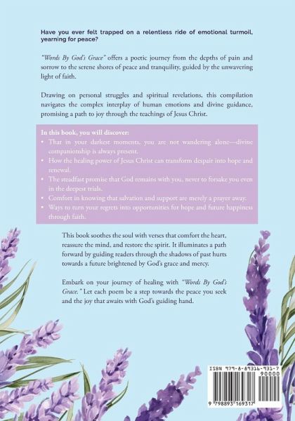 "Words By God's Grace" offers a poetic journey from the depths of pain and sorrow to the serene shores of peace and tranquility, guided by the unwavering light of faith. Drawing on personal struggles and spiritual revelations, this compilation navigates the complex interplay of human emotions and divine guidance, promising a path to joy through the teachings of Jesus Christ. In this book, you will discover: ¿ That in your darkest moments, you are not wandering alone-divine companionship is always present. ¿ How the healing power of Jesus Christ can transform despair into hope and renewal. ¿ The steadfast promise that God remains with you, never to forsake you even in the deepest trials. ¿ Comfort in knowing that salvation and support are merely a prayer away. ¿ Ways to turn your regrets into opportunities for hope and future happiness through faith. This book soothes the soul with verses that comfort the heart, reassure the mind, and restore the spirit. It illuminates a path forward by guiding readers through the shadows of past hurts towards a future brightened by God's grace and mercy. Embark on your journey of healing with "Words By God's Grace." Let each poem be a step towards the peace you seek and the joy that awaits with God's guiding hand. Many times, when we are going through trials and tribulations, we can feel all alone - like we are the only person in the world who has gone through what we are going through. And the questions, so many questions. Will it ever end? How can it get much worse than this? Will I ever smile and laugh again? Will life ever be "normal," peaceful again? I know firsthand how hard it can be. I have asked all the questions and I have lived with pain and sorrow. I can't answer your questions. But I can tell you that pain and sorrow eventually turn into peace and tranquility and that joy is waiting somewhere down the road. And I can promise that if you walk with God, He will lead you there.