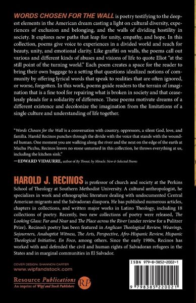 Words Chosen for the Wall is poetry testifying to the deepest elements in the American dream casting a light on cultural diversity, experiences of exclusion and belonging, and the walls of dividing hostility in society. It explores new paths that leap for unity, empathy, and hope. In this collection, poems give voice to experiences in a divided world and reach for beauty, unity, and emotional clarity. Like graffiti on walls, the poems call out various and different kinds of abuses and visions of life to quote Eliot ""at the still point of the turning world."" Each poem creates a space for the reader to bring their own baggage to a setting that questions idealized notions of community by offering lyrical words that speak to realities that are often ignored, or worse, forgotten. In this work, poems guide readers to the terrain of imagination that is a fine tool for repairing what is broken in society and that ceaselessly pleads for a solidarity of difference. These poems motivate dreams of a different existence and decolonize the imagination from the limitations of a single culture and understanding of life together.