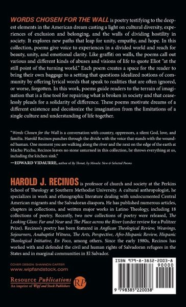 Words Chosen for the Wall is poetry testifying to the deepest elements in the American dream casting a light on cultural diversity, experiences of exclusion and belonging, and the walls of dividing hostility in society. It explores new paths that leap for unity, empathy, and hope. In this collection, poems give voice to experiences in a divided world and reach for beauty, unity, and emotional clarity. Like graffiti on walls, the poems call out various and different kinds of abuses and visions of life to quote Eliot ""at the still point of the turning world."" Each poem creates a space for the reader to bring their own baggage to a setting that questions idealized notions of community by offering lyrical words that speak to realities that are often ignored, or worse, forgotten. In this work, poems guide readers to the terrain of imagination that is a fine tool for repairing what is broken in society and that ceaselessly pleads for a solidarity of difference. These poems motivate dreams of a different existence and decolonize the imagination from the limitations of a single culture and understanding of life together.