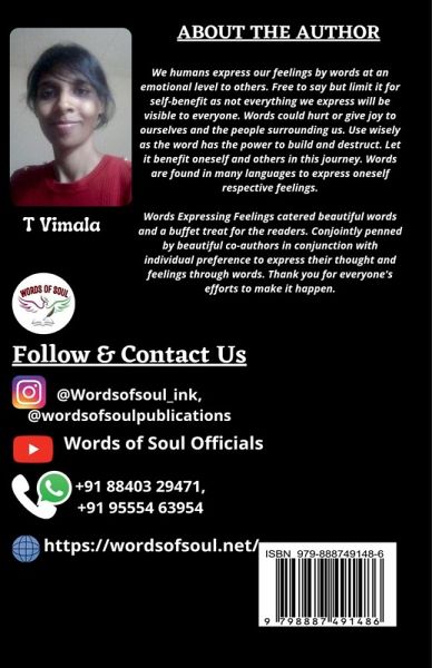 We humans express our feelings by words at an emotional level to others. Free to say but limit it for self-benefit as not everything we express will be visible to everyone. Words could hurt or give joy to ourselves and the people surrounding us. Use wisely as the word has the power to build and destruct. Let it benefit oneself and others in this journey. Words are found in many languages to express oneself respective feelings. Words Expressing Feelings catered beautiful words and a buffet treat for the readers. Conjointly penned by beautiful co-authors in conjunction with individual preference to express their thought and feelings through words. Thank you for everyone's efforts to make it happen.