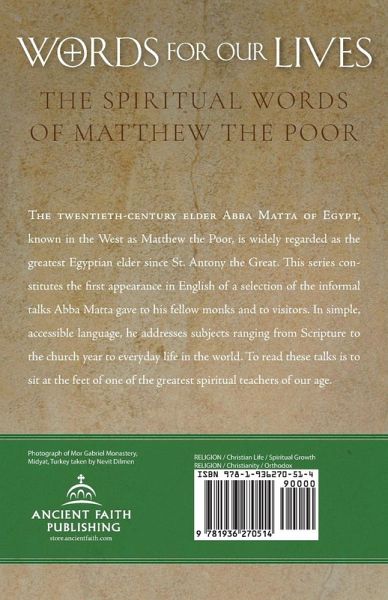 The twentieth-century elder Abba Matta of Egypt, known in the West as Matthew the Poor, is widely regarded as the greatest Egyptian elder since St. Antony the Great. This series constitutes the first appearance in English of a selection of the informal talks Abba Matta gave to his fellow monks and to visitors. In simple, accessible language, he addresses subjects ranging from Scripture to the church year to everyday life in the world. To read these talks is to sit at the feet of one of the greatest spiritual teachers of our age. See also Words for Our Time: The Spiritual Words of Matthew the Poor, Volume 1