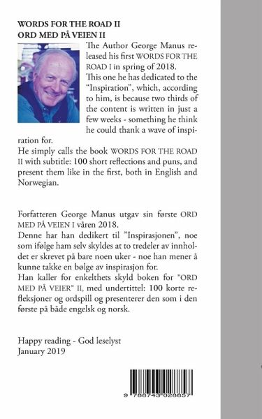 The Author George Manus released his first "ORDS FOR THE ROAD" in the spring of 2018.This one he has dedicated to the "Inspiration", which, according to him, is because two thirds of the content is written in just a few weeks - something he thinks he could thank a wave of inspiration for.He simply calls the book "WORDS FOR THE ROAD II" with subtitle: 117 short reflections and puns, and present them like the first one in both English and Norwegian.Could it be a coincidence that this book contains 117 short reflections, and the first one 114?The Authors lucky numbers are 14 and 17.