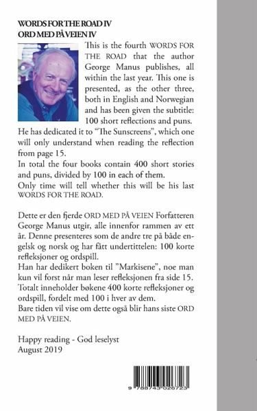 This is the fourth "WORDS FOR THE ROAD" that the author George Manus publishes, all within the last year. This one is presented, as the other three, both in English and Norwegian and has been given the subtitle: 107 short reflections and puns. In total the books contain 459 short stories and puns, divided by 114 in the first, 117 in the second, 121 in the third and 107 in this one.7-14-17 and 21 are the author lucky numbers. As all his lucky numbers now has been used, only time will tell whether this will be his last "WORDS FOR THE ROAD".