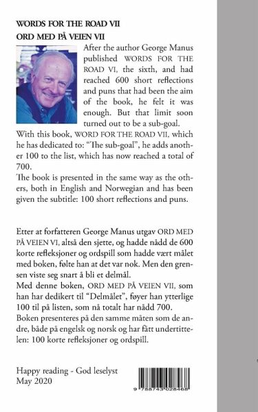 This WORDS FOR THE ROAD VII, the seventh in a row, is dedicated to "Opinions" and given the same subtitle as the others: 100 short reflections and puns. All my words for the road, which now have reached 800, are expressions of my spontaneous opinions and thoughts when they were put on paper.Some of them the reader will find obvious while others could have been shaped differently or not be included at all. But, in between there may be some one will take notice off and some that give an afterthought. If so, my purpose for them is achieved.The reflection "The sub-goal", written in 1995, which is copied from the book REFLECTIONS I is about golf but is, in my opinion, just as valid when it comes to writing. The expression: "It is not the goal that counts but the process" also applies here. It is reproduced from page 14.As in the previous WORDS FOR THE ROAD, the table of contents is presented in alphabetical order in both English and Norwegian. In the book the English comes first, with the corresponding Norwegian next to it.If you should get the feeling that you´ve heard some of them before, I can assure you it has never been my intention to plagiarize.