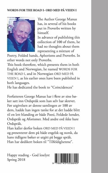 The Author George Manus has, in several of his books put in Proverbs written by himself.In advance of publishing this collection of 114 of them, he had no thoughts about them representing a mixture of Poetry, Folded hands, Aphorisms and Proverbs. In other words not only Proverbs.This book therefore, which presents them in both English and Norwegian, he named WORDS FOR THE ROAD, as his earlier ones have been published in both languages.