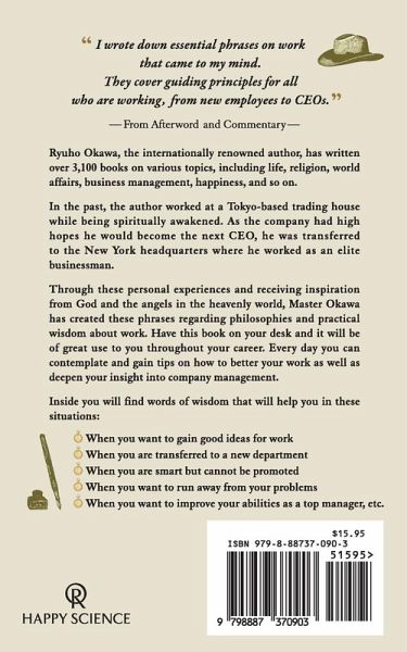 "I wrote down essential phrases on work that came to my mind. They cover guiding principles for all who are working, from new employees to CEOs." (From Afterword and Commentary) Ryuho Okawa, the internationally renowned author, has written over 3,100 books on various topics, including life, religion, world affairs, business management, happiness, and so on. To help readers find the teachings that are beneficial for them out of the extensive teachings, the author has published several books that compile 100 essential phrases. This book is the second English-translated book of the series right after Words for Life. In the past, Master Okawa worked at a Tokyo-based trading company while being spiritually awakened. As the company had high hopes he would become the next CEO, he was transferred to the New York headquarters where he worked as an elite businessman. After realizing his true mission for the world, he resigned from the company and founded Happy Science which has now developed into the most influential religion in Japan and has members in 168 countries around the world. Through these personal experiences and receiving inspiration from God and the angels in the heavenly world, Master Okawa has created these phrases regarding philosophies and practical wisdom about work. Have this book on your desk and it will be of great use to you throughout your career. Every day you can contemplate and gain tips on how to better your work as well as deepen your insight into company management. Inside you will find words of wisdom that will help you in these situations: - When you want to gain good ideas for work - When you are transferred to a new department - When you are smart but cannot be promoted - When you want to run away from your problems - When you want to raise your abilities as a top manager, etc.