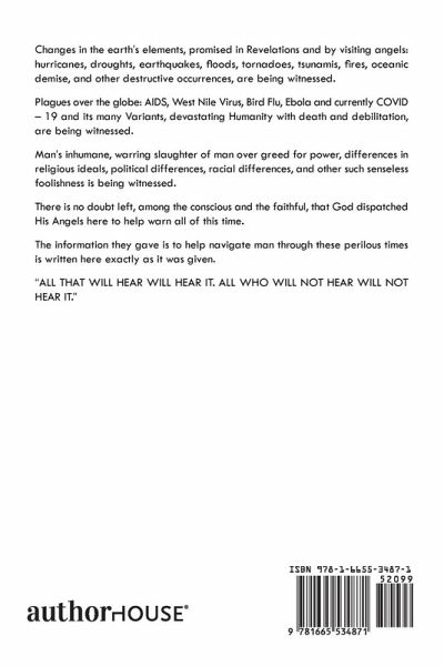 Changes in the earth's elements, promised in Revelations and by visiting angels: hurricanes, droughts, earthquakes, floods, tornadoes, tsunamis, fires, oceanic demise, and other destructive occurrences, are being witnessed. Plagues over the globe: AIDS, West Nile Virus, Bird Flu, Ebola and currently COVID - 19 and its many Variants, devastating Humanity with death and debilitation, are being witnessed. Man's inhumane, warring slaughter of man over greed for power, differences in religious ideals, political differences, racial differences, and other such senseless foolishness is being witnessed. There is no doubt left, among the conscious and the faithful, that God dispatched His Angels here to help warn all of this time. The information they gave is to help navigate man through these perilous times is written here exactly as it was given. "ALL THAT WILL HEAR WILL HEAR IT. ALL WHO WILL NOT HEAR WILL NOT HEAR IT."