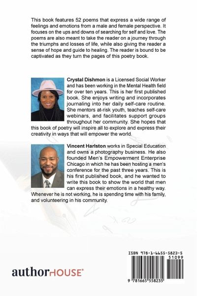 The authors of this piece pour their hearts and souls into this collection of poems about love and life. It features 52 poems that express a wide range of feelings and emotions from a male and female perspective. It focuses on the ups and downs of searching for self and love. The poems are meant to take the reader on a journey through the triumphs and losses of life, while also giving the reader a sense of hope. The reader is bound to be captivated as they turn the pages of this poetry book.