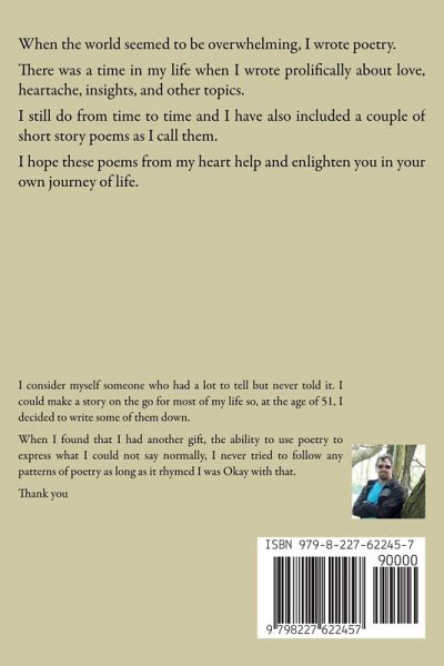 When the world seemed to be overwhelming, I wrote poetry. There was a time in my life when I wrote prolifically about love, heartache, insights, and other topics. I still do from time to time and I have also included a couple of short story poems as I call them. I hope these poems from my heart help and enlighten you in your own journey of life.