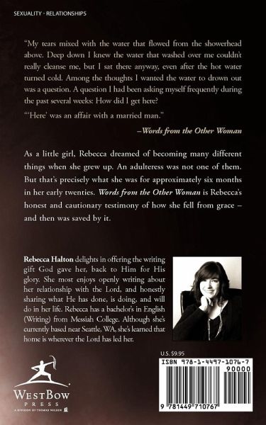 A compelling true account of one woman's experience as the other woman in an extra-marital affair. "My tears mixed with the water that flowed from the showerhead above. Deep down I knew the water that washed over me couldn't really cleanse me, but I sat there anyway, even after the hot water turned cold. Among the thoughts I wanted the water to drown out was a question. A question I had been asking myself frequently during the past several weeks: How did I get here? "Here" was an affair with a married man." ~Words from the Other Woman As a little girl, Rebecca dreamed of becoming many different things when she grew up. An adulteress was not one of them. But that's precisely what she was for approximately six months in her early twenties. Words from the Other Woman is Rebecca's honest and cautionary testimony of how she fell from grace - and then was saved by it.