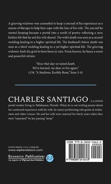 A grieving widower was counseled to keep a journal of his experience as a means of therapy to help him cope with the loss of his wife. The journal he started keeping became a portal into a world of poetry reflecting a new, hidden life that he and his wife shared. The wife's death was seen as a second wedding leading to a higher spiritual life. The husband's future death was seen as a third wedding leading to a yet higher spiritual life. The grieving widower finds his grief to have been in vain. From heaven, he hears a sweet and powerful refrain: ""Since that day we tasted death, We've learned, my dear, to live again."" (134. ""A Studious, Earthly Beau,"" lines 3-4)