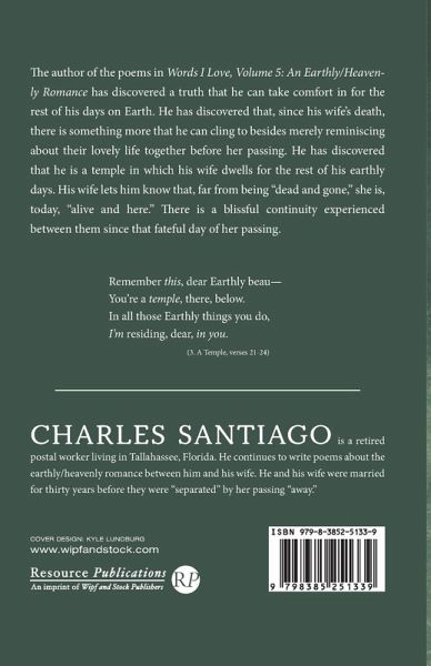 The author of the poems in Words I Love, Volume 5: An Earthly/Heavenly Romance has discovered a truth that he can take comfort in for the rest of his days on Earth. He has discovered that, since his wife’s death, there is something more that he can cling to besides merely reminiscing about their lovely life together before her passing. He has discovered that he is a temple in which his wife dwells for the rest of his earthly days. His wife lets him know that, far from being "dead and gone," she is, today, "alive and here." There is a blissful continuity experienced between them since that fateful day of her passing. Remember this, dear Earthly beau— You’re a temple, there, below. In all those Earthly things you do, I’m residing, dear, in you. (3. A Temple, verses 21-24)