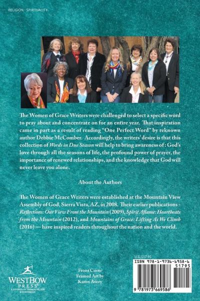 The Women of Grace Writers were challenged to select a specific word to pray about and concentrate on for an entire year. That inspiration came in part as a result of reading "One Perfect Word" by reknown author Debbie McComber. Accordingly, the writers' desire is that this collection of Words in Due Season will help to bring awareness of : God's love through all the seasons of life, the profound power of prayer, the importance of renewed relationships, and the knowledge that God will never leave you alone.