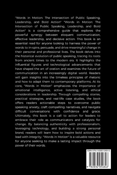 Words in Motion: The Intersection of Public Speaking, Leadership, and Bold Action "Words in Motion: The Intersection of Public Speaking, Leadership, and Bold Action" is a comprehensive guide that explores the powerful synergy between eloquent communication, effective leadership, and decisive action. This book is an essential read for anyone looking to harness the power of words to inspire, persuade, and drive meaningful change in their personal and professional lives. The book delves into the historical evolution of public speaking, tracing its roots from ancient times to the modern era. It highlights the influential figures and technological advancements that have shaped the art of oration and examines the future of communication in an increasingly digital world. Readers will gain insights into the timeless principles of rhetoric and how to adapt them to contemporary platforms. At its core, "Words in Motion" emphasizes the importance of emotional intelligence, active listening, and ethical considerations in leadership. Through compelling stories, practical strategies, and real-life case studies, the book offers readers actionable steps to overcome public speaking anxiety, craft compelling narratives, and navigate difficult conversations with confidence and grace. Ultimately, this book is a call to action for leaders to embrace their role as communicators and catalysts for change. By balancing authenticity with professionalism, leveraging technology, and building a strong personal brand, readers will learn how to inspire bold actions and lead with integrity. "Words in Motion" is a valuable resource for anyone seeking to make a lasting impact through the power of their words.