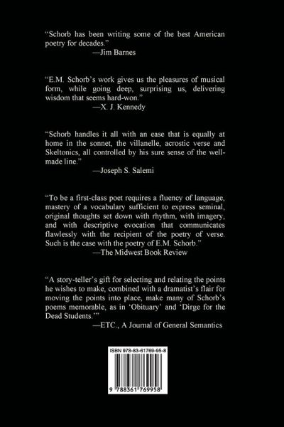 E.M. Schorb is a prize-winning poet, novelist, and short story writer. As a poet, his Murderer’s Day was awarded the Verna Emery Poetry Prize and published by Purdue University Press; and his collection, Time and Fevers, was the recipient of the Writer’s Digest International Self-Published Award for Poetry and also an Eric Hoffer Award. Other works include 50 Poems, Hill House New York, Reflections in a Doubtful I, White Violet Press, The Journey and Related Poems, Aldrich Press, The Ideologues and Other Retrospective Poems, Aldrich Press, and The Poor Boy, Dragon’s Teeth Press, Living Poets Series. The title poem, "The Poor Boy," was awarded the International Keats Poetry Prize by London Literary Editions, Ltd., judged by Howard Sergeant. Schorb’s novel, Paradise Square, received the Grand Prize for Fiction from the International eBook Award Foundation at the Frankfurt Book Fair. A Portable Chaos was the First Prize Winner of the Eric Hoffer Award for Fiction. But Schorb maintains that he is first and foremost a poet, and his poetry has appeared in hundreds of publications, here and abroad.